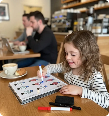 Keeps kids busy and learning while waiting — no phones, no mess, no noise.