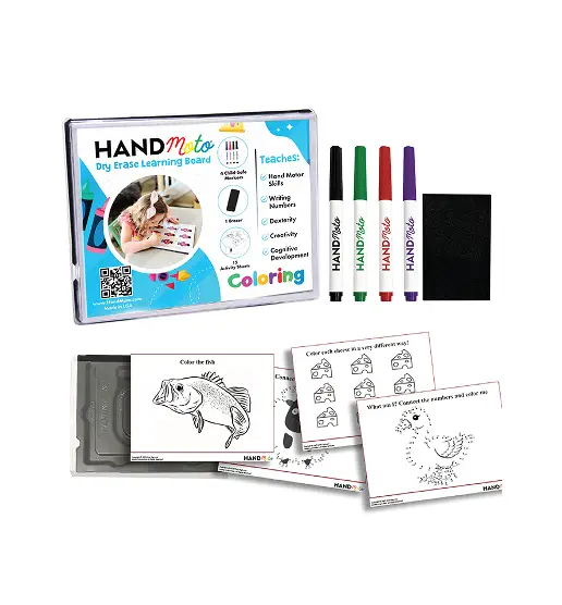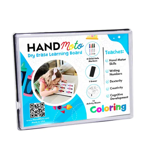 The Coloring HandMoto Board is a dry-erase activity system that keeps kids focused, supports color recognition, and builds fine motor skills all without screens or mess.