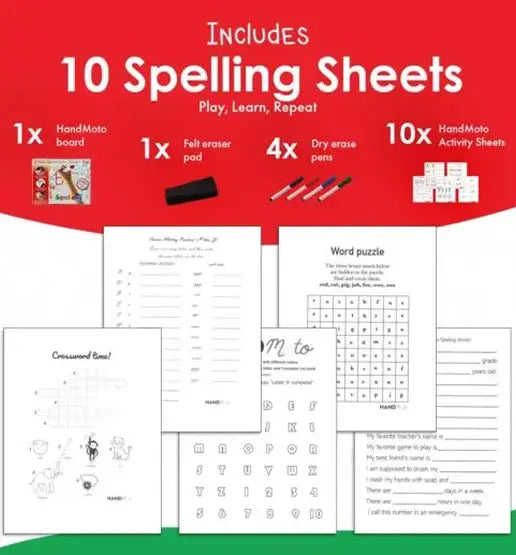 Our HandMoto Spelling Board Comes with 15 Printable Activity Sheets